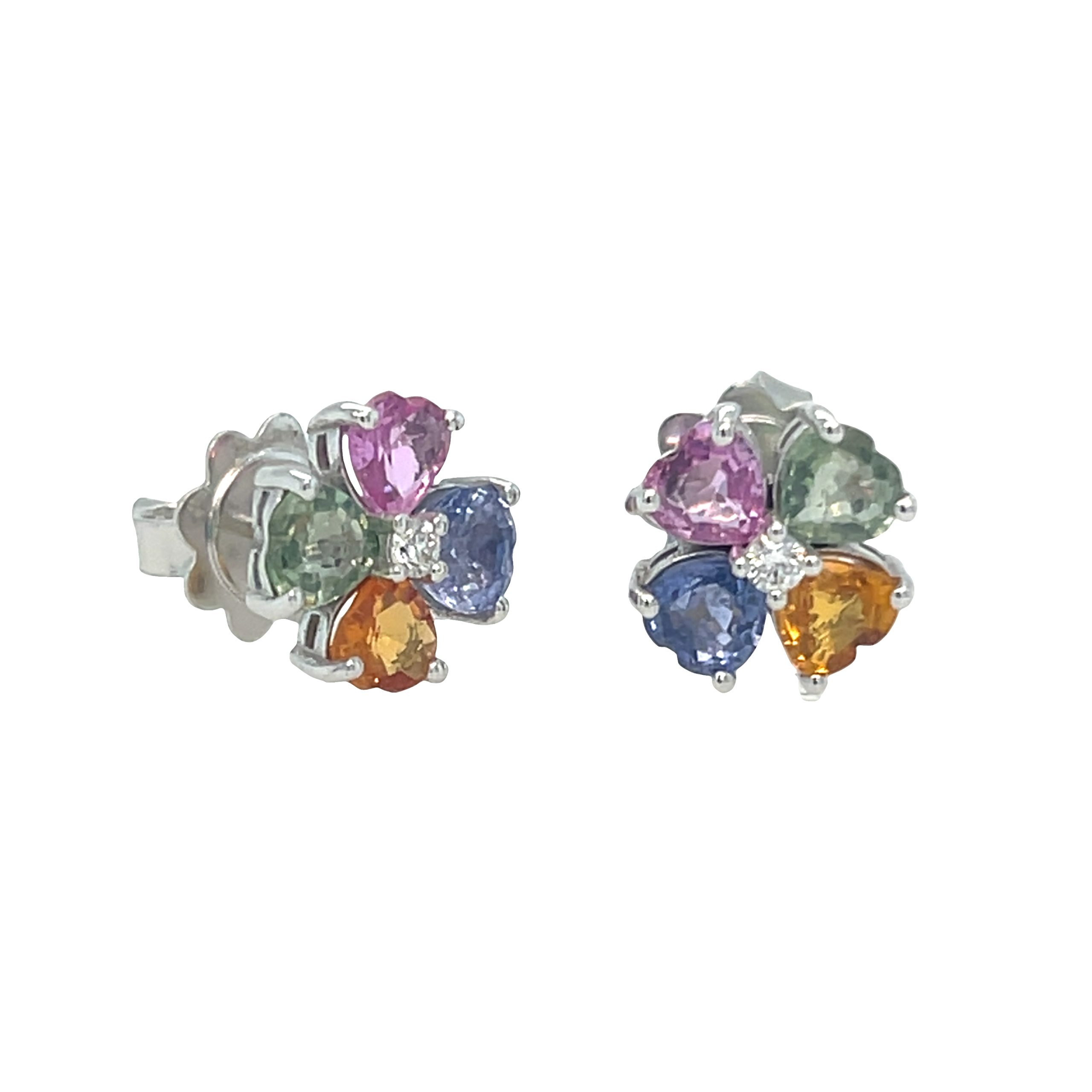 Exquisite Multi-Sapphire stud earrings crafted in lustrous 18ct White Gold. The gemstones are displayed in a flower shape with a diamond centre. Perfect for adding a touch of colour to any ensemble.