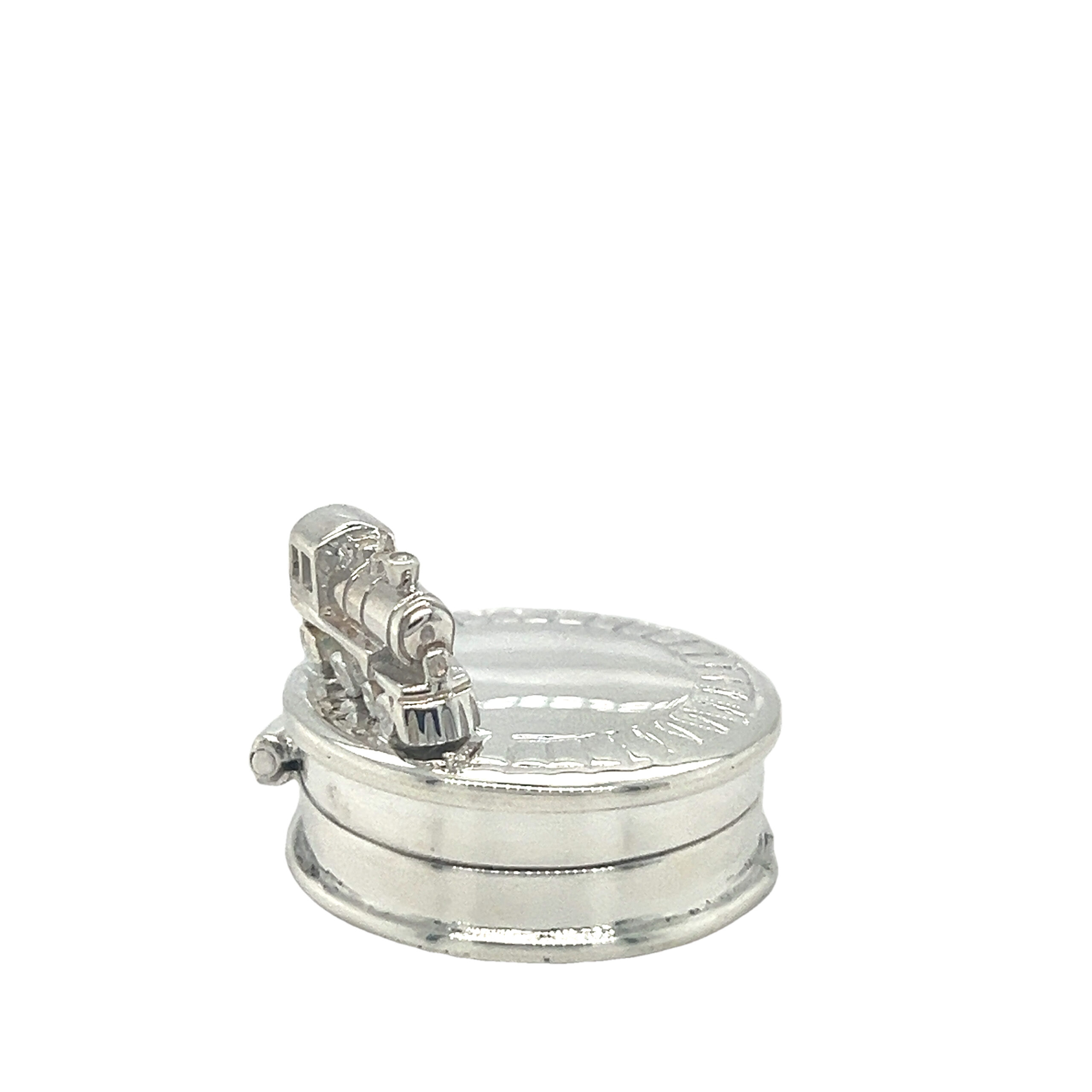 Sterling Silver Tooth Fairy Box with a Steam Train on Track. Used for keeping treasured keepsakes in such as a babies first lock of hair or first tooth. These boxes make superb Christening gift.